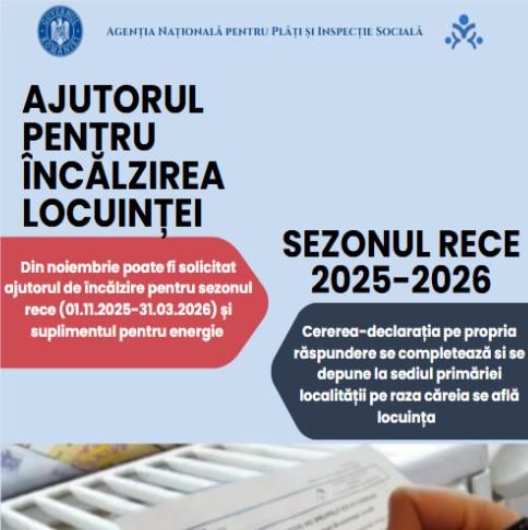 Persoanele aflate în situații vulnerabile pot depune cereri pentru a beneficia de ajutorul la încălzire și de suplimentul pentru energie.Sprijinul financiar se acordă pe toată durata sezonului rece (1 noiembrie 2025 – 31 martie 2026), în cazul ajutorului pentru încălzire, iar suplimentul pentru energie este acordat pe parcursul întregului an.