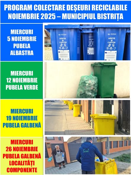 - 19 noiembrie 2025 – pubela galbenă, pentru plastic și metal (doar în municipiul Bistrița);