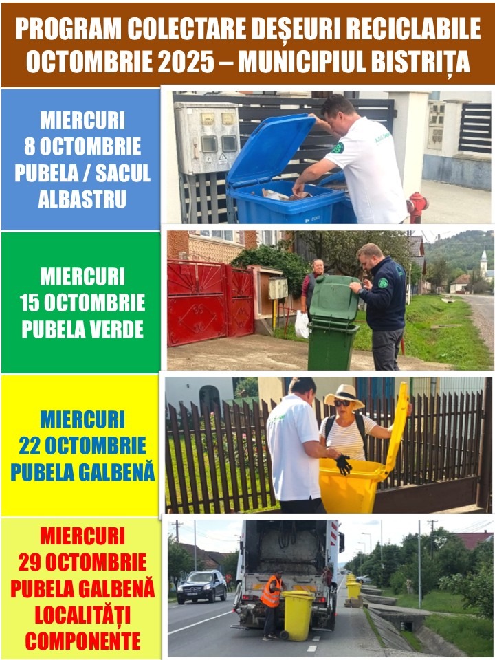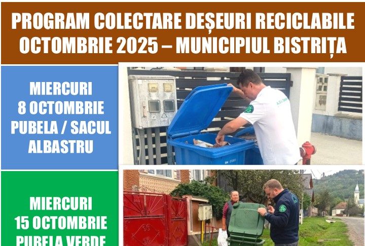 ADI Deșeuri Bistrița-Năsăud anunță că, în luna octombrie 2025, programul de colectare a deșeurilor reciclabile pentru municipiul Bistrița și localitățile componente va începe din prima săptămână întreagă a lunii.