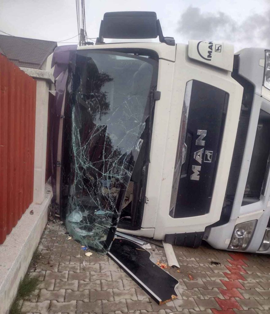 Din primele date, un ansamblu format din autoutilitară și semiremorcă, condus de un bărbat de 41 de ani, din Maieru, s-a răsturnat, intrând în coliziune cu gardurile a două imobile.