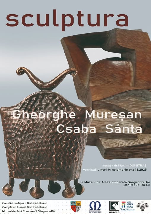 Complexul Muzeal Bistrița-Năsăud organizează vineri, 14 noiembrie 2025, la ora 18:00, vernisajul unei expoziții de sculptură în bronz semnată de artiștii Gheorghe Mureșan și Sánta Csaba. Evenimentul va avea loc la Muzeul de Artă Comparată din Sângeorz-Băi.