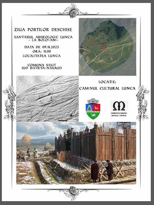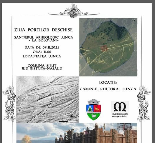 Complexul Muzeal Bistrița-Năsăud, în parteneriat cu Primăria comunei Șieuț, organizează duminică, 9 noiembrie 2025, de la ora 11:00, la Căminul Cultural din Lunca (comuna Șieuț, județul Bistrița-Năsăud), evenimentul „Ziua Porților Deschise – șantierul arheologic Lunca – La Bolovani”.